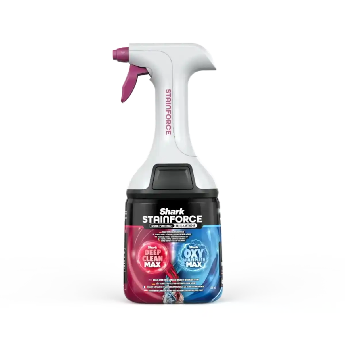 Náhradní náplň a rozprašovač Shark StainForce Dual-Formula s vynikající účinností odstraňují odolné nečistoty v domácnosti. Složení s 30násobnou čisticí silou se aktivuje při kontaktu s povrchem a rozkládá i ty nejhorší, dokonce i zaschlé skvrny. Složení pro neutralizaci zápachu okamžitě eliminuje nepříjemné pachy, jako je zvířecí moč nebo kouř. Směs šetrná k domácím mazlíčkům a dětem je bezpečná pro použití na koberce, čalounění a interiéry automobilů.